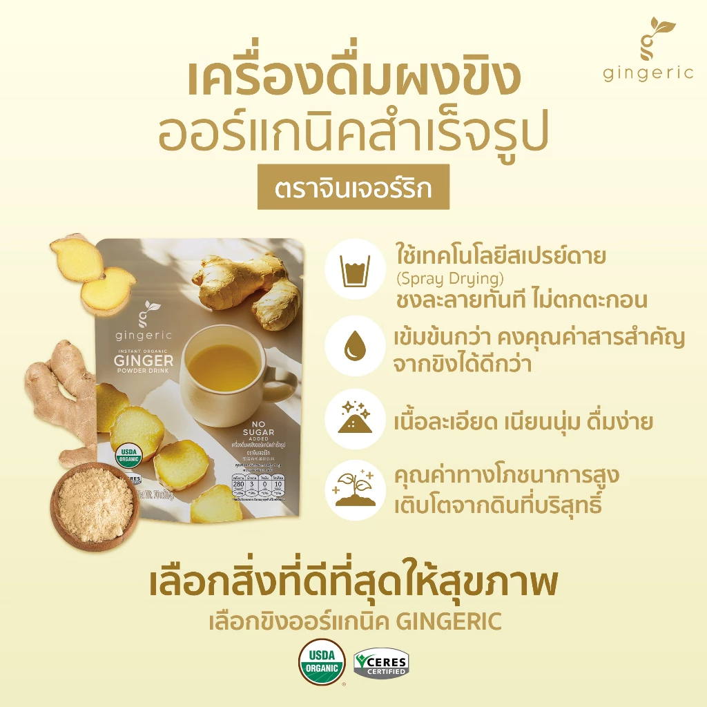 ผงขิงสกัดออร์แก​นิค​ 100% ไม่มีกากตะกอน ละลายทันที ไม่มีน้ำตาล มีฮาลาล